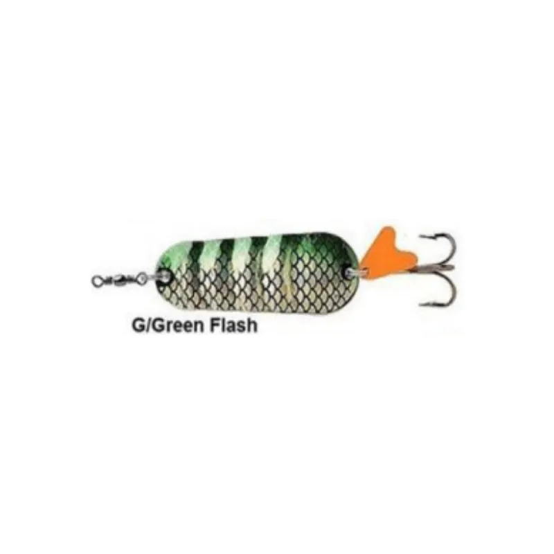 Tipo: Señuelo de pesca, Peso: 35 gramos, Color: G/Green Flash (Verde con destellos brillantes), Material: Metal de alta resistencia, Forma: Compacta y aerodinámica, Acción: Hundimiento medio, ideal para pesca en profundidad, Gancho: Doble y afilado, diseñado para resistir el tirón de peces grandes, Ideal para: Peces depredadores como lubinas, truchas y otros depredadores marinos, Uso recomendado: Pesca en agua salada y dulce, especialmente efectivo para trolling y pesca a casting, Resistencia: Alta durabilidad frente a condiciones extremas, recomendado para aguas turbias y profundas.