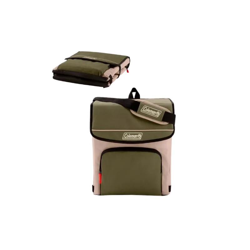 Tipo: Bolso térmico, Marca: Coleman, Capacidad: 34 latas, Color: Verde, Material: Exterior de poliéster resistente y forro interior antimicrobiano que previene olores, moho y hongos, Características: Diseño flexible y ligero, con aislamiento de alta calidad para mantener la temperatura de los alimentos y bebidas, bolsillo frontal con cremallera para almacenamiento adicional, Ideal para: Campistas, pescadores, excursionistas y viajeros que necesitan transportar bebidas y alimentos frescos de manera cómoda, Uso recomendado: Perfecto para picnics, días de playa, camping o cualquier actividad al aire libre, Resistencia: Alta, diseñado para soportar el uso frecuente y condiciones exigentes.