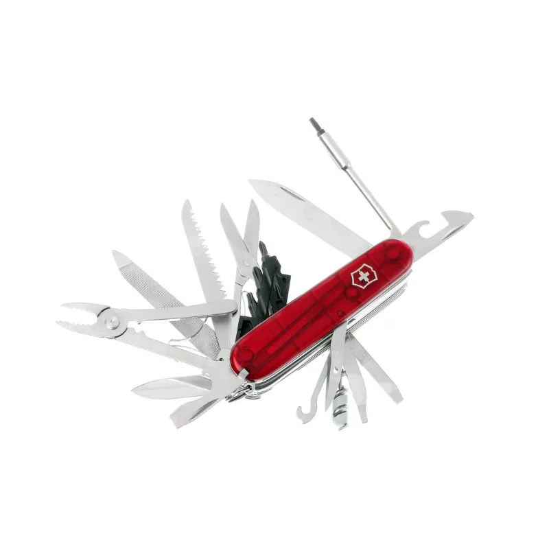 Hoja grande, Hoja pequeña, Sierra para madera, Abrelatas, Destornillador 3 mm, Destapador, Sacacorchos, Punzón escariador, Pinzas, Palillo de dientes, Anilla, Lima para metal, Lima para madera, Cortacuerdas, Cuchillo de desollar, Tijeras, Corta cables, Pesa de pesca, Sierra para metal, Punzón, Ganchos para equipo, Destornillador 6 mm, Cuchillo para cortar cuerdas, Corta cuerda, Limpiador de escamas, Plegadora, Punzón para marineros, Cortador de cables, Lija, Cortador de alambre grueso, Saca clavos, Abrelatas de precisión, Lijadora, Corta cuero, Alicates, Cortador de alambre, Destornillador 2 mm, Raspador