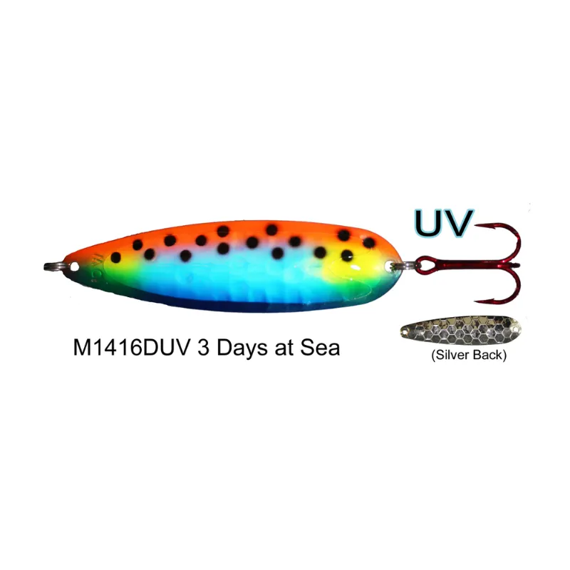 Tipo: Señuelo de pesca, Material: Metal, Color: Combinación de tonos azules y plateados, Peso: 10 g, Diseño: Forma de cuchara con detalles reflectantes, Uso: Pesca en agua dulce y salada, Característica especial: Acabado que imita reflejos submarinos, Compatibilidad: Ideal para especies como truchas y salmones, Presentación: Blister individual, Ideal para: Trolling y spinning, Ventaja: Alta durabilidad y eficacia en aguas claras y profundas.