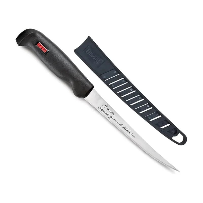 Fileteador Rapala Fish Camp. Hoja de acero inoxidable de 6\” afilada a mano. Mango de agarre cómodo de termoplástico moldeado en negro con protección para dedos integrada. Vaina abierta de polímero moldeado en negro, fácil de limpiar. Empaquetado para colgar.