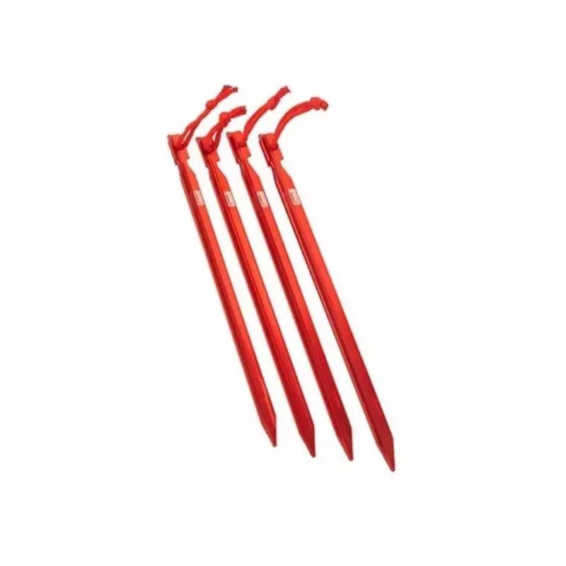 Tipo: Estacas, Marca: Coleman, Material: Aluminio, Color: Rojas, Cantidad: Pack de 4, Características: Estacas ligeras y resistentes, diseñadas para asegurar tiendas de campaña y otros equipos de camping, Diseño: Con una punta afilada para facilitar la inserción en el suelo, Ideal para: Campistas y pescadores que necesitan estacas duraderas y fáciles de transportar para asegurar sus tiendas de campaña, Uso recomendado: Perfectas para acampadas y actividades al aire libre, Resistencia: Alta, diseñadas para soportar condiciones exteriores y el uso frecuente.