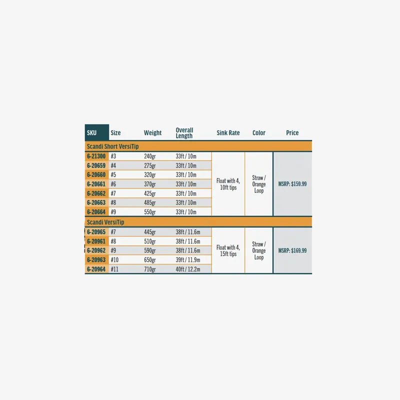 La Scandi Short VersiTip es ideal para cañas de menos de 13 pies, y está disponible en # 4 a # 9. Todas las puntas y el cuerpo están construidos en ConnectCore ultra bajo de estiramiento de RIO para obtener lo mejor en control y sensibilidad.