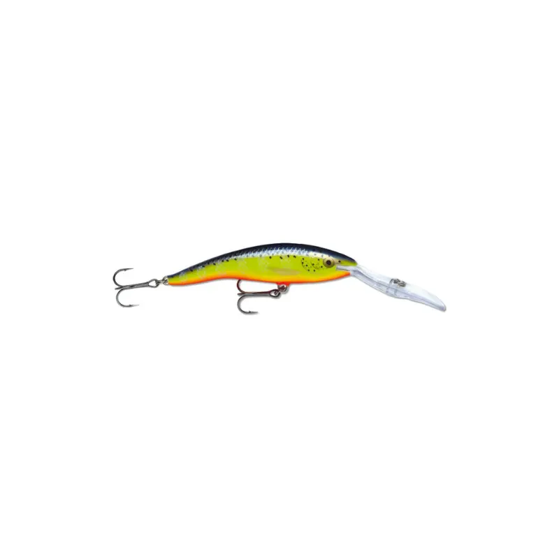 Tipo: Señuelo de pesca Modelo: RAPALA TDD9 HS Longitud: 9 cm Peso: 13 gr Material: Madera de balsa premium pintada Uso: Pesca deportiva en agua dulce y salada Características adicionales: Diseño de cuerpo de banana que proporciona un notable bamboleo a su cola, acción de \”peces heridos\”, sonajero interno Profundidad de natación: Hasta 10 metros Anzuelos: Triples VMC black nickel Aplicación: Spinning pesado y trolling profundo, ideal para capturar especies predadoras grandes